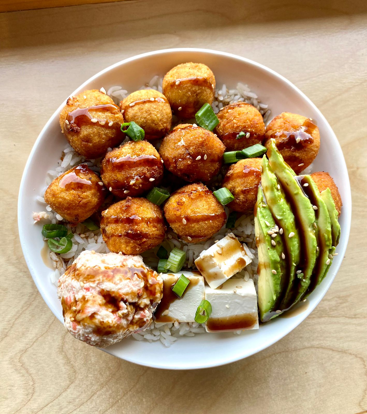 Aguacates tempura bañados en salsa de anguila y mayo spicy, acompañado de una bola de tampico