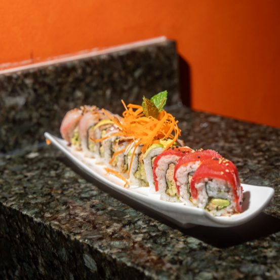 Pepino, aguacate, camarón cocido (30gr), pesca del día (35gr), pulpo (30gr), kanikama, jengibre, cebollín y cilantro. Forrado alga nori. Salsa de aceite de rayu y salsa de anguila.