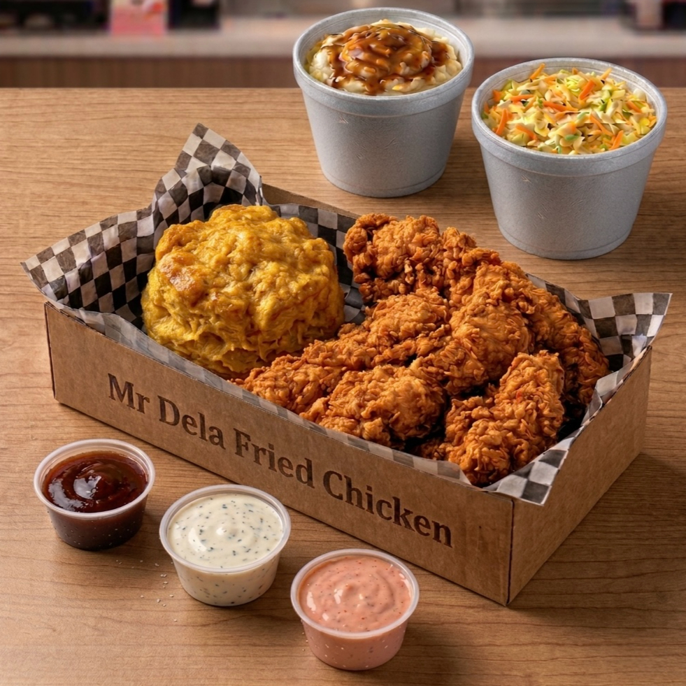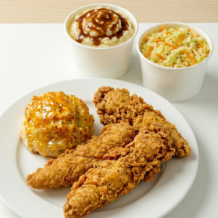 300 gramos de Tenders de pollo, 1 complemento grande (puré de papa o ensalada) y 3 biscuits (pancitos de mantequilla).