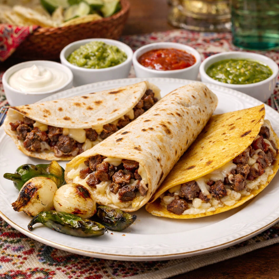 Quesadilla estilo norteño: harina calientita, asada jugosa, queso derretido, guacamole real espesito, salsa tatemada y limón. Hecha al momento.