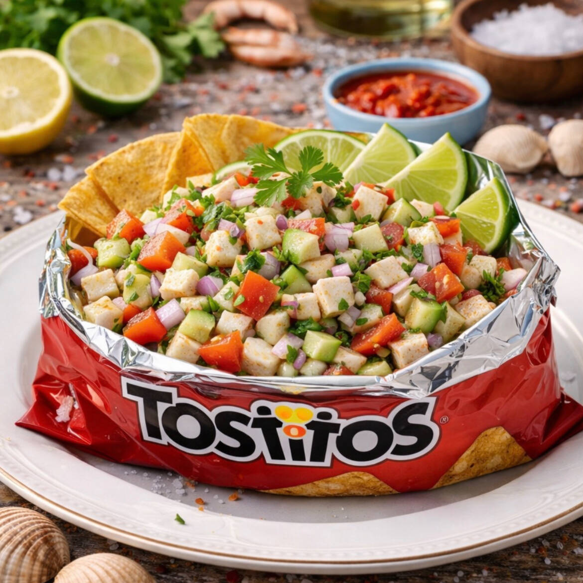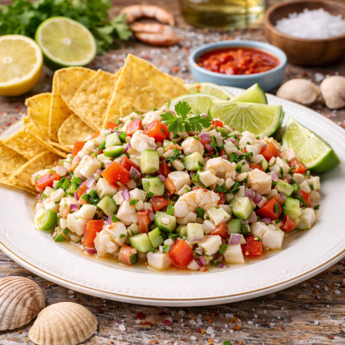 Ceviche preparado al momento con pescado fresco, vegetales y limón natural.