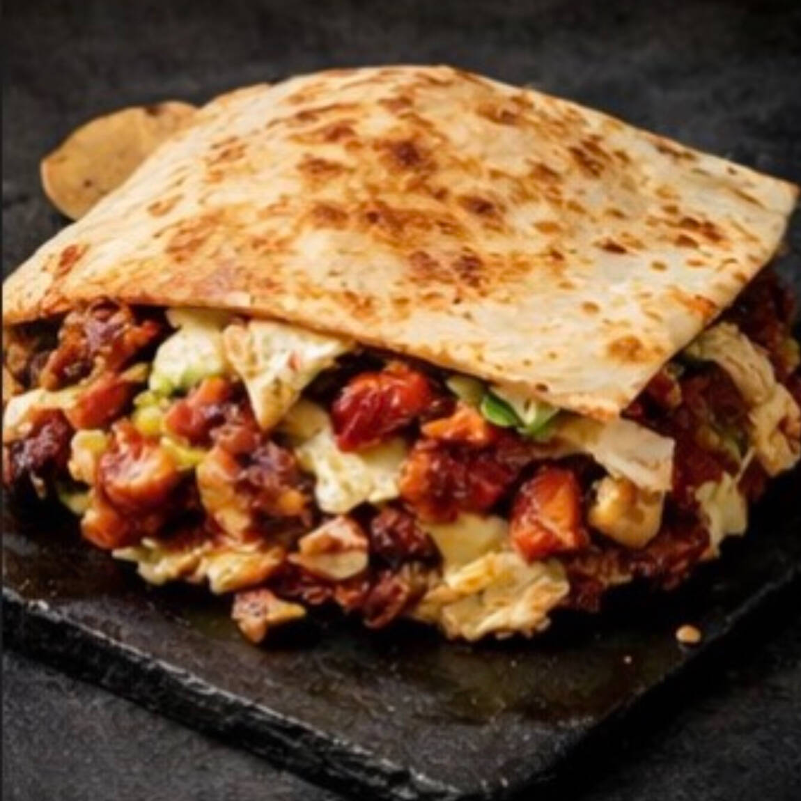 Quesadilla de harina con asada, chorizo, jamón, salchicha, tocino y queso + verduras. Porción poderosa. Si tenías hambre: ya no.