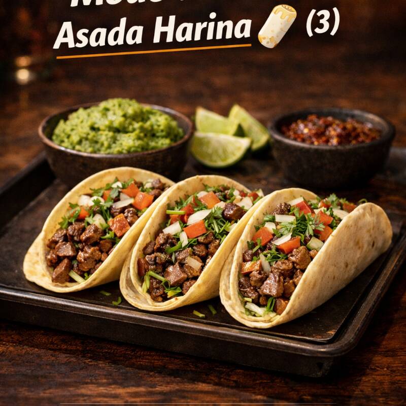 3 tacos de harina estilo norteño con asada + tomate, cebolla, cilantro, repollo, salsa, limón y guacamole real
