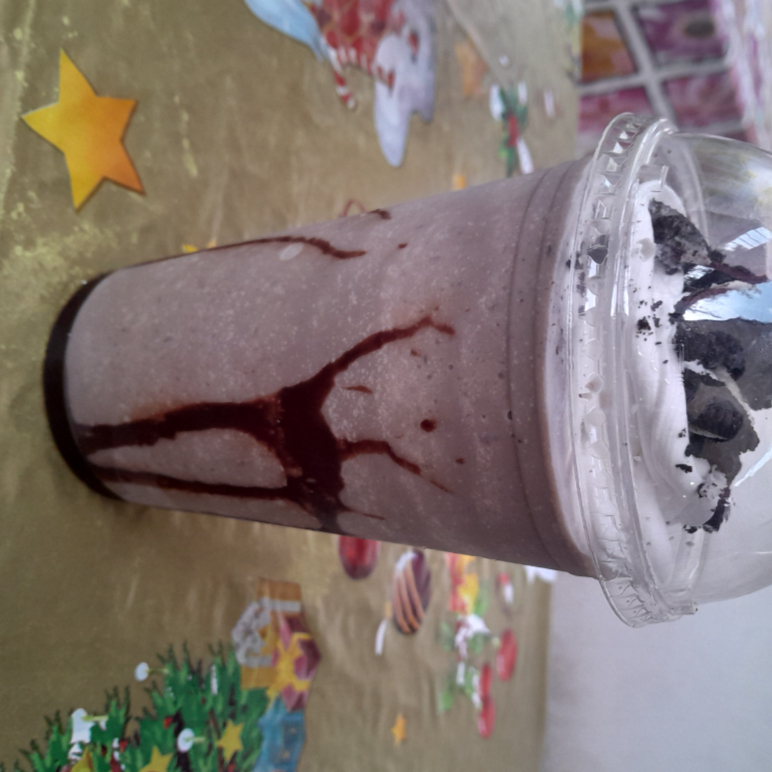 Galleta Oreo, leche , hielo, crema batida ,chocolate liquido para decorar