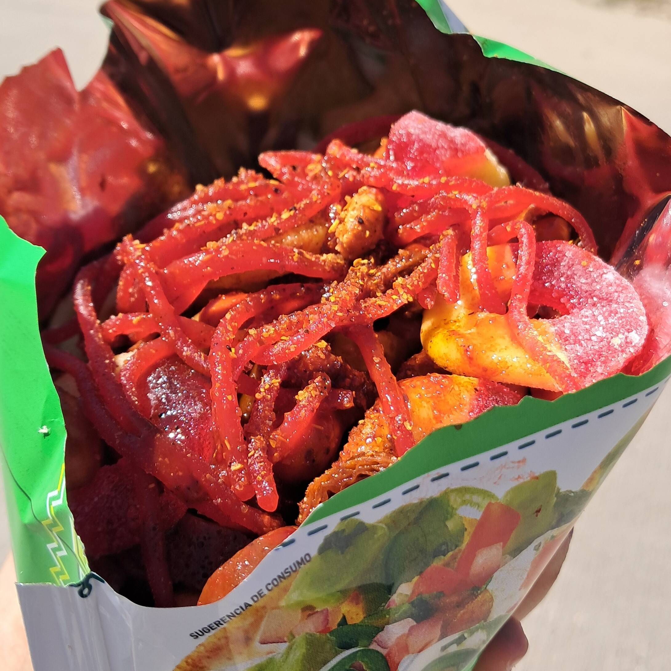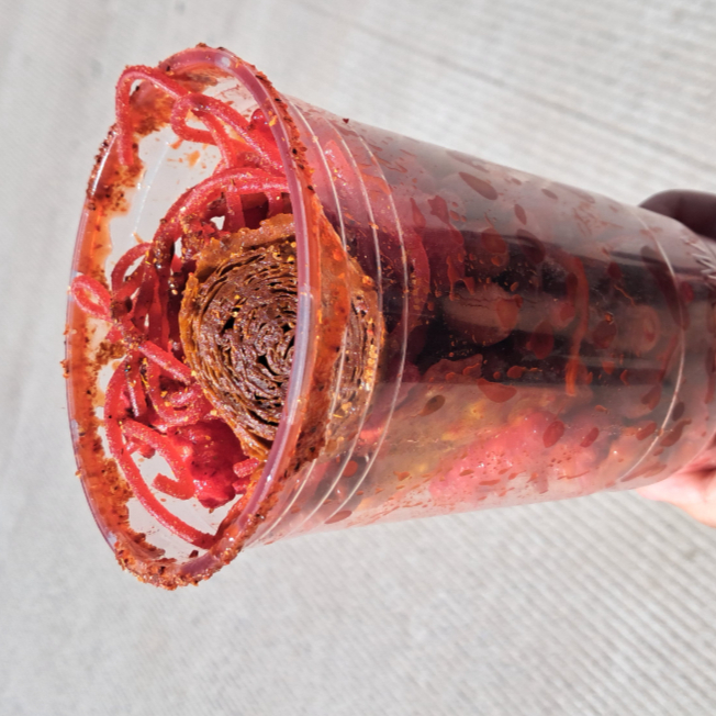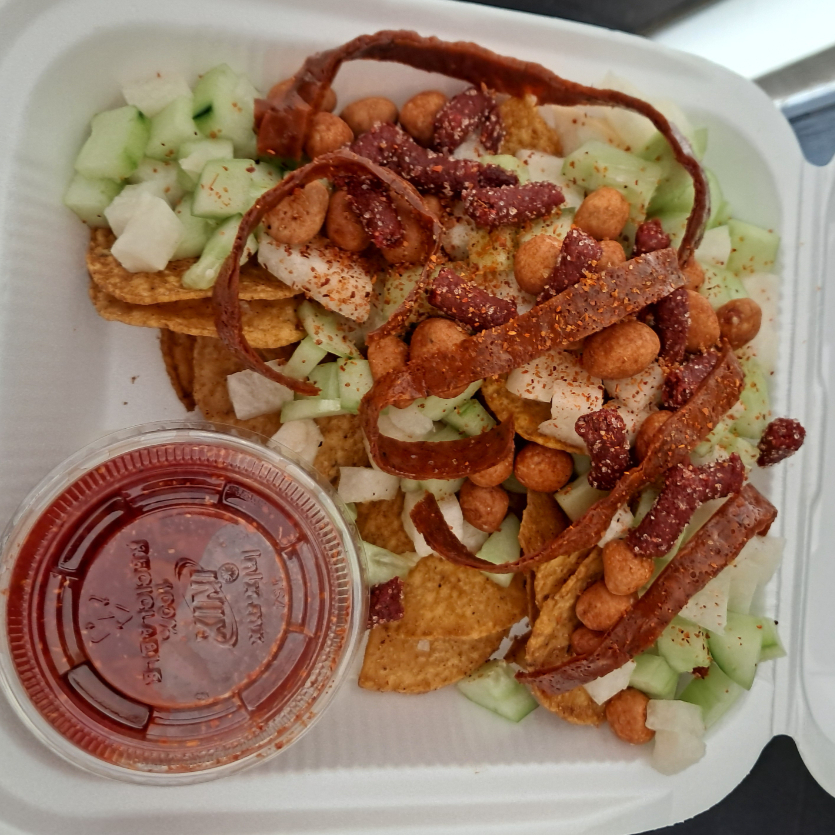 Jicama, pepino, rielito, cacahuate, skwinkles, gomitas, chamoy, valentina, clamato y serpentina