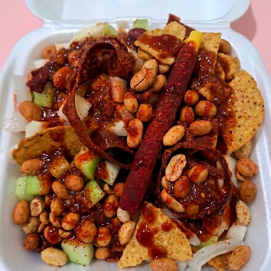 Tres frituras a elegir, extra cacahuate, extra rielito, skwinkles, serpentina, chamoy, clamato y valentina