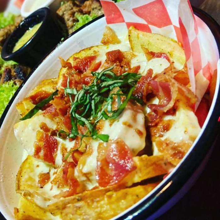 Papas naturales hechas al momento, queso gratinado, trozos de tocino.