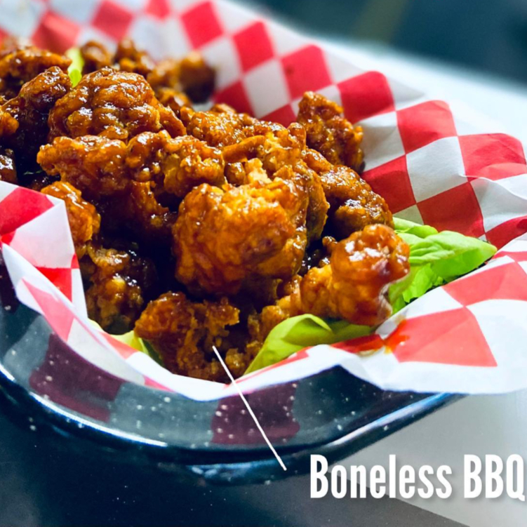 Medio kilo de tiras de pechuga de pollo crujiente con salsa BBQ y aderezo de la casa.