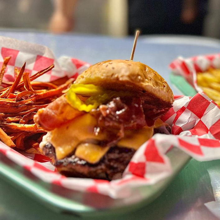 160 g. de carne angus, tocino, queso cheddar, tomate, lechuga y aderezo de la casa.