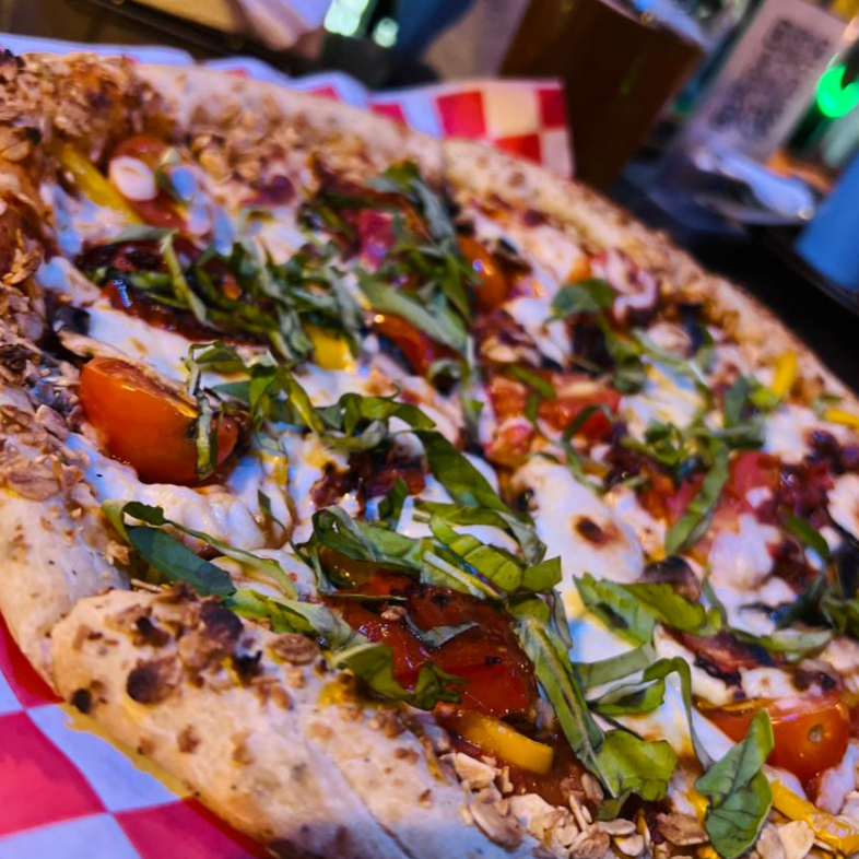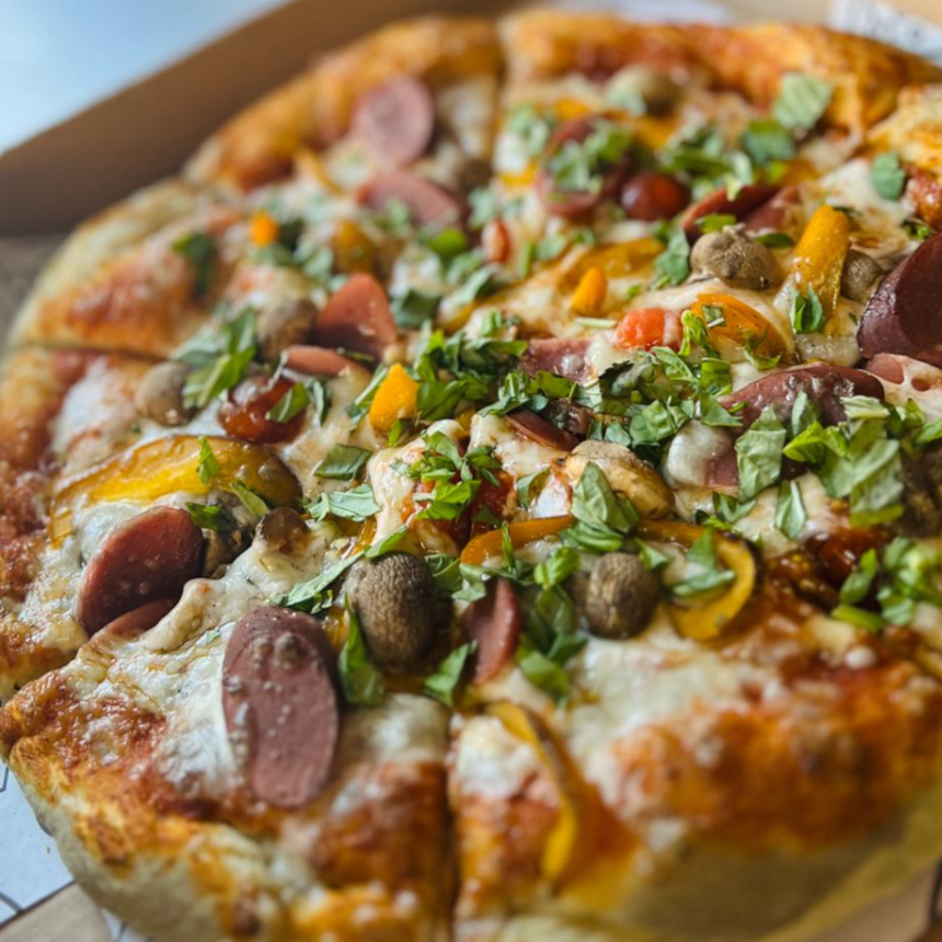 Queso mozzarella ,salami, champiñones,tomate cherry, pimientos morrón y albahaca fresca.