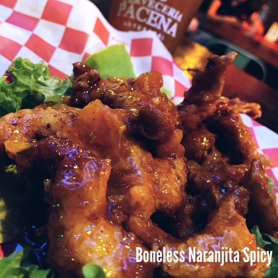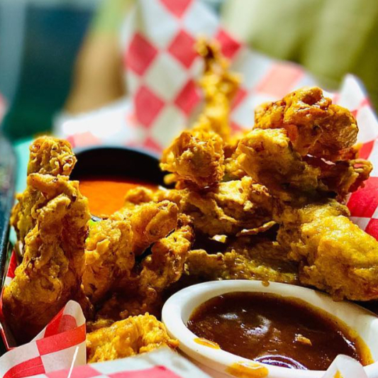 Medio kilo de tiras de pechuga de pollo crujiente con salsa Mango Spicy y aderezo de la casa.