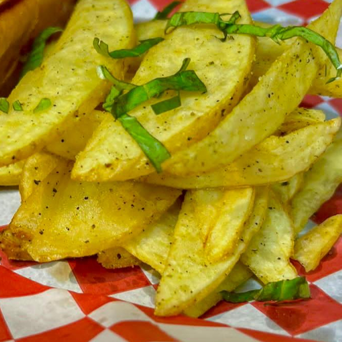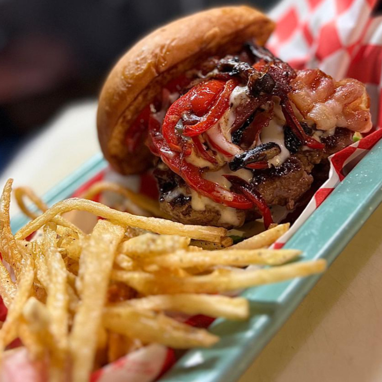 160 grs. de carne angus, trozos de tocino, queso mozzarella, champiñones salteados, mezcla de pimientos y aderezo de la casa.