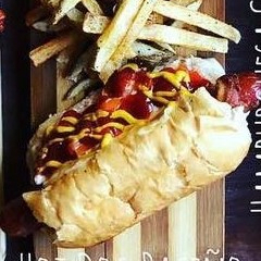 salchicha jumbo, tocino, tomate, mostaza, catsup y aderezo de la casa.