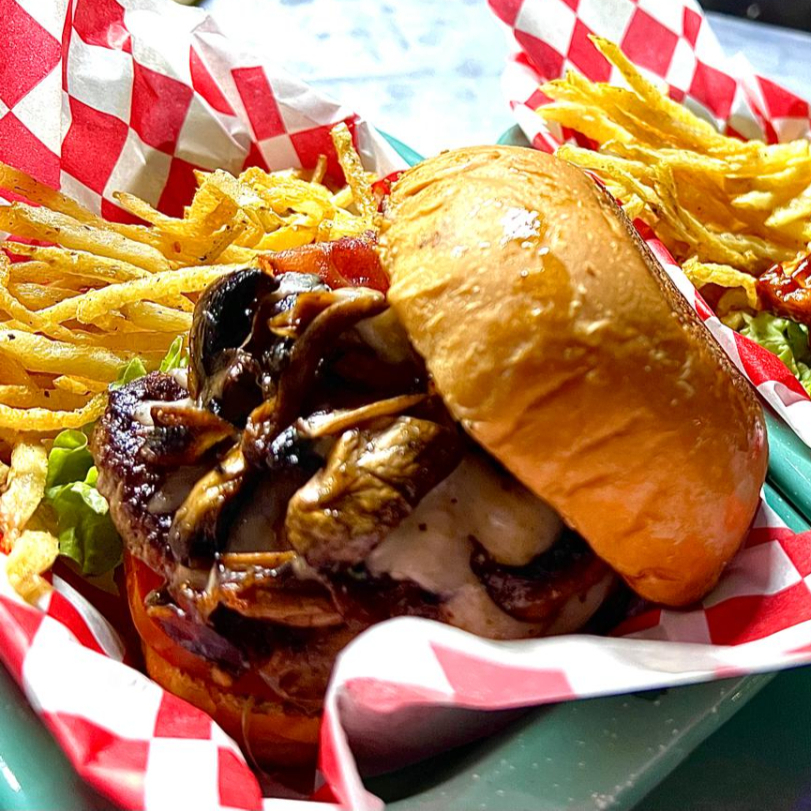 160 grs. de carne black angus, queso mozzarella, champiñones salteados, tocino, tomate, lechuga y aderezo de la casa.