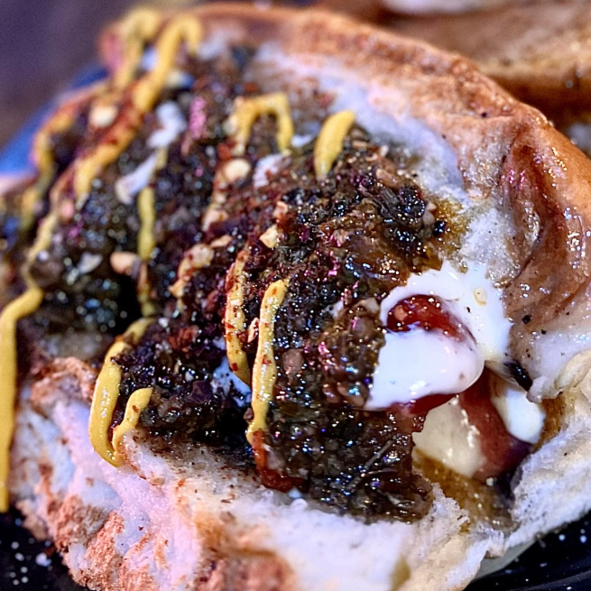 Chorizo argentino, tocino crujiente, queso mozarella y chimichurri de la casa.