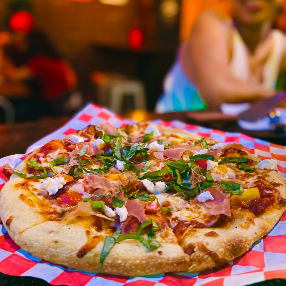 Queso mozzarella , salsa pomodoro, jamón serrano, queso cabra, tomate cherry y albahaca fresca. cherry,