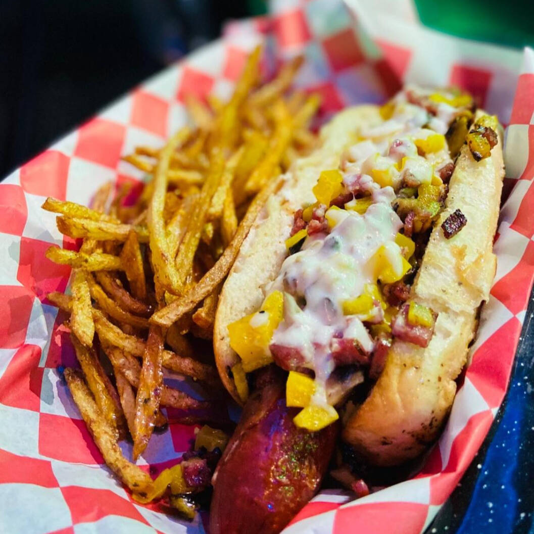 salchicha jumbo, queso mozarella, mezcla de pimientos, champiñones salteados y aderezo de la casa.