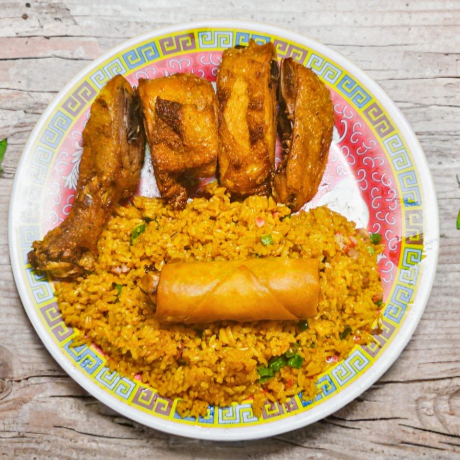 Pierna de Pollo Frito, Arroz frito con puerco y 1 Pieza de Chunkun. Incluye 1 Salsa Siracha y 1 Salsa Soya.