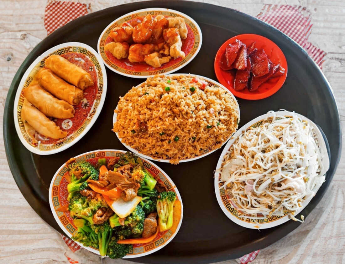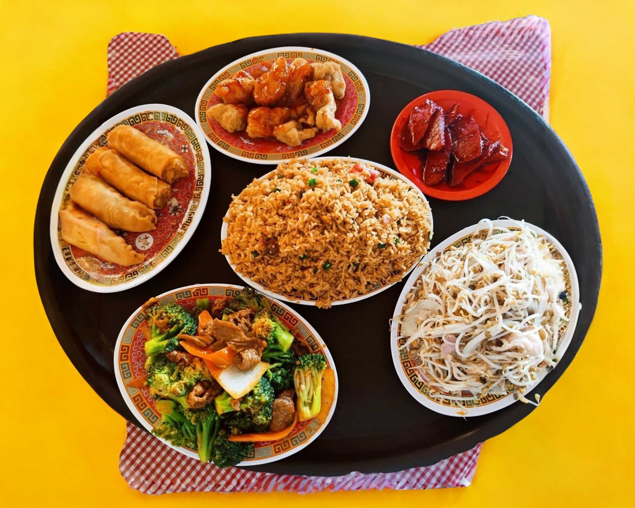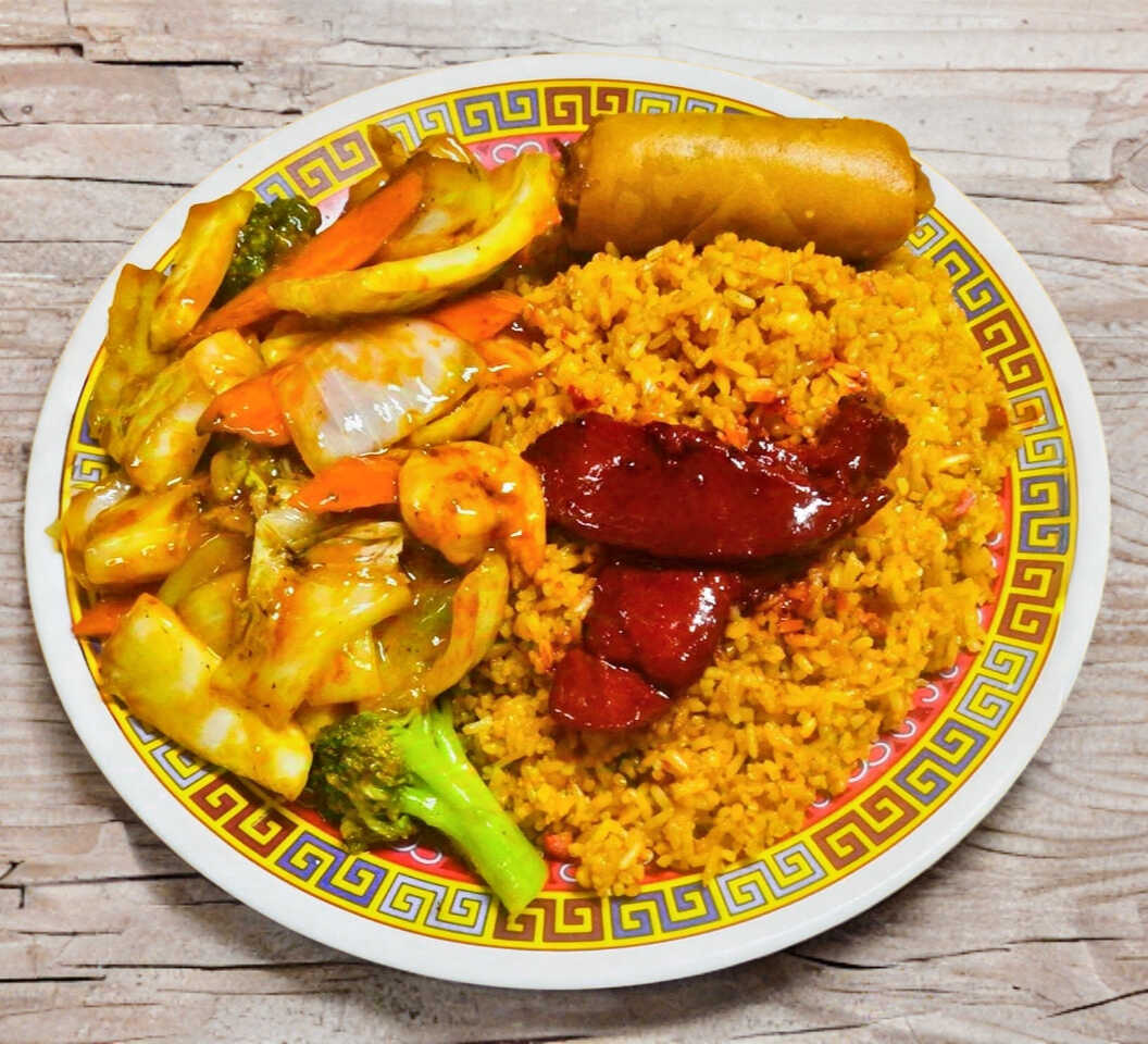Guisado Combinación China (proteínas Pollo, Res, Puerco y Camarón), Arroz frito con puerco, 2 Piezas de Carnitas Coloradas y 1 Pieza de Chunkun. Incluye 1 Salsa Siracha y 1 Salsa Soya.