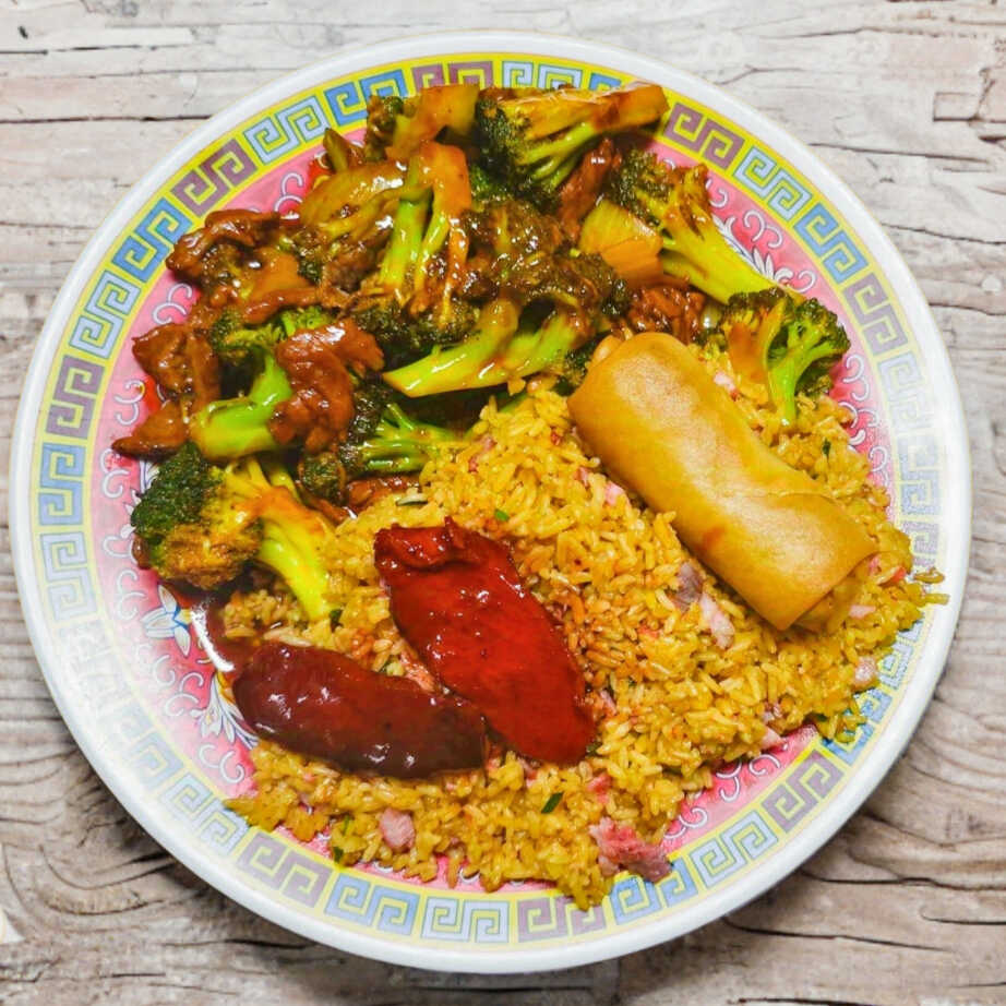 Guisado Brócoli con Res, Arroz frito con puerco, 2 Piezas de Carnitas Coloradas y 1 Pieza de Chunkun. Incluye 1 Salsa Siracha y 1 Salsa Soya.