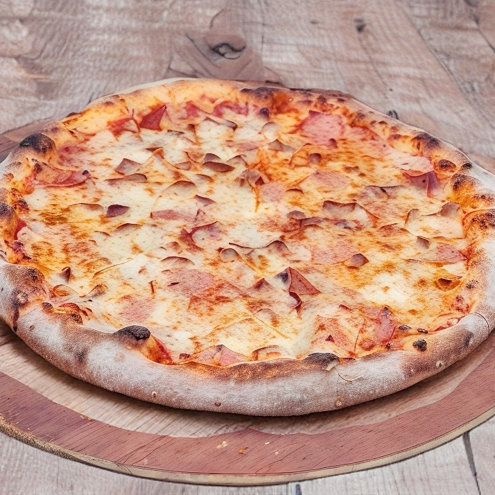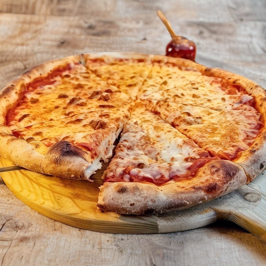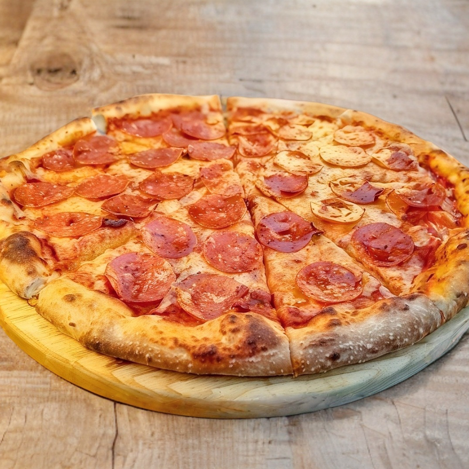 Pizza grande con rebanadas de pepperoni y queso fundido.
