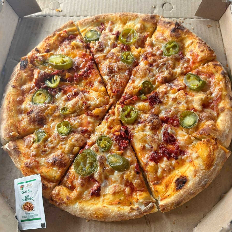 Pizza con ingredientes al estilo mexicano: chorizo, jalapeños y más.