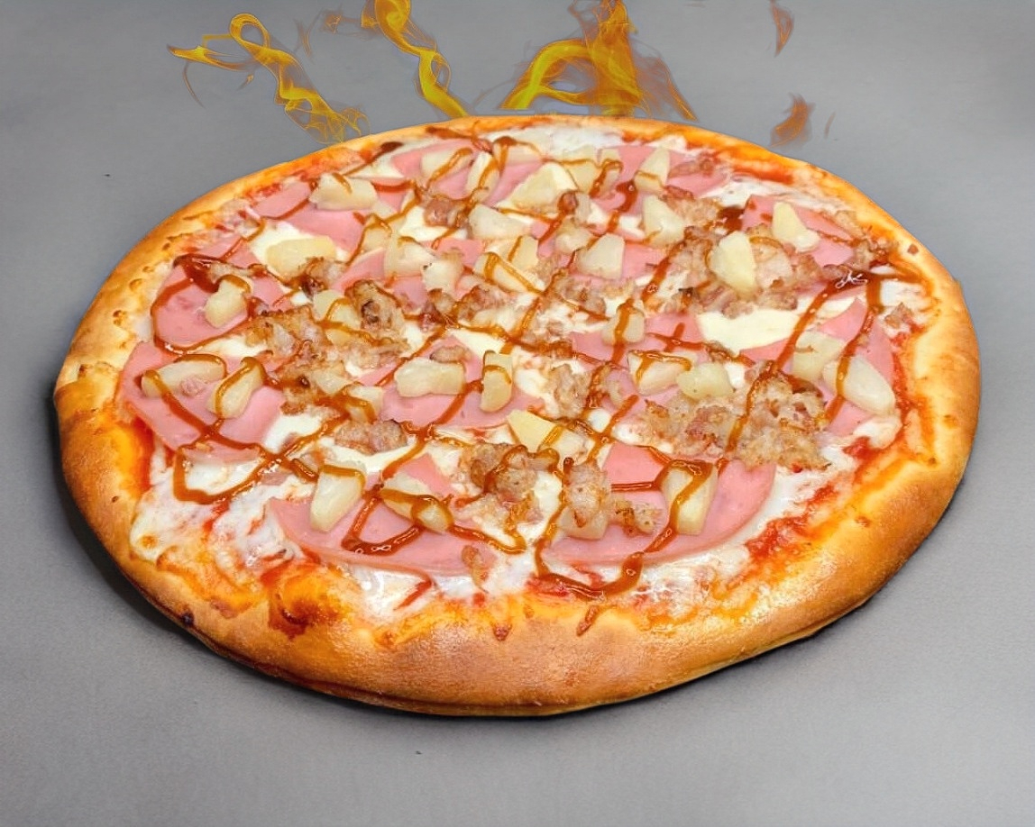 Jamón de pavo, tocino, piña, salsa BBQ.