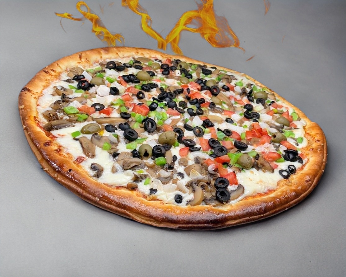 Champiñones, pimiento morrón, cebolla, tomate, aceituna verde, aceituna negra.