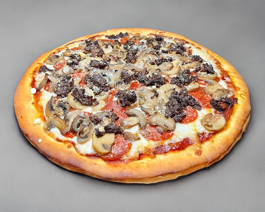 Ingredientes disponibles: champiñones, pepperoni, jamón, salchicha, chilorio, tocino, chorizo, frijol, pimiento morrón, piña, cebollín, mango, aceituna negra, aceituna verde, tomate, cebolla, BBQ, parmesano.