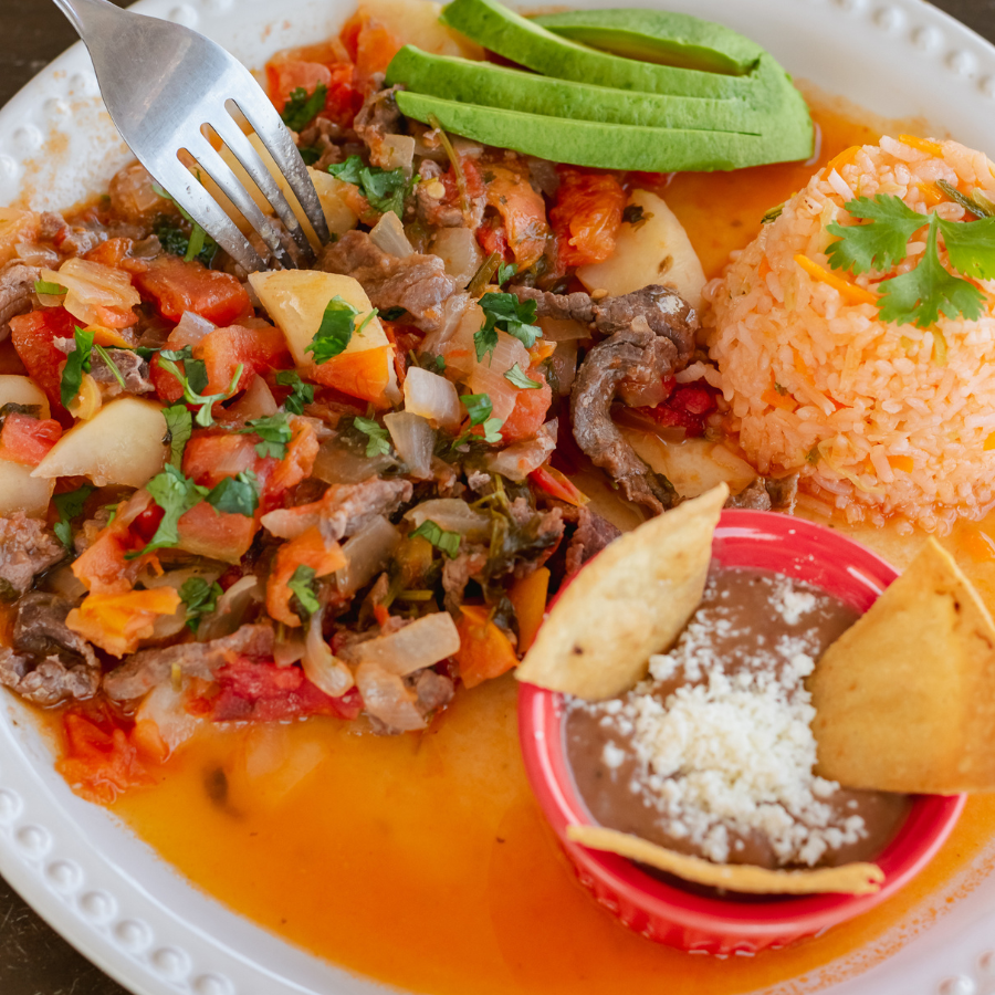 Bisteck ranchero, 2 enchiladas, 1 quesadilla de harina, acompañado de arroz, frijol y aguacate.
