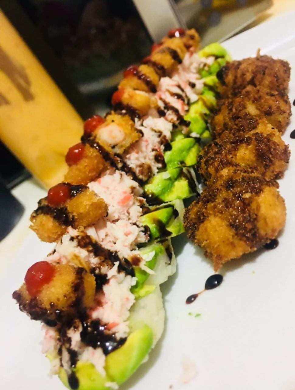Por dentro, pepino, aguacate y Philadelphia por fuera forrado de aguacate, topping de Tampico con camarones empanizado puntos de siracha y rayado de anguila