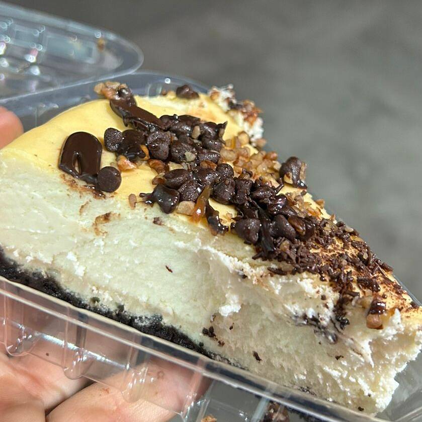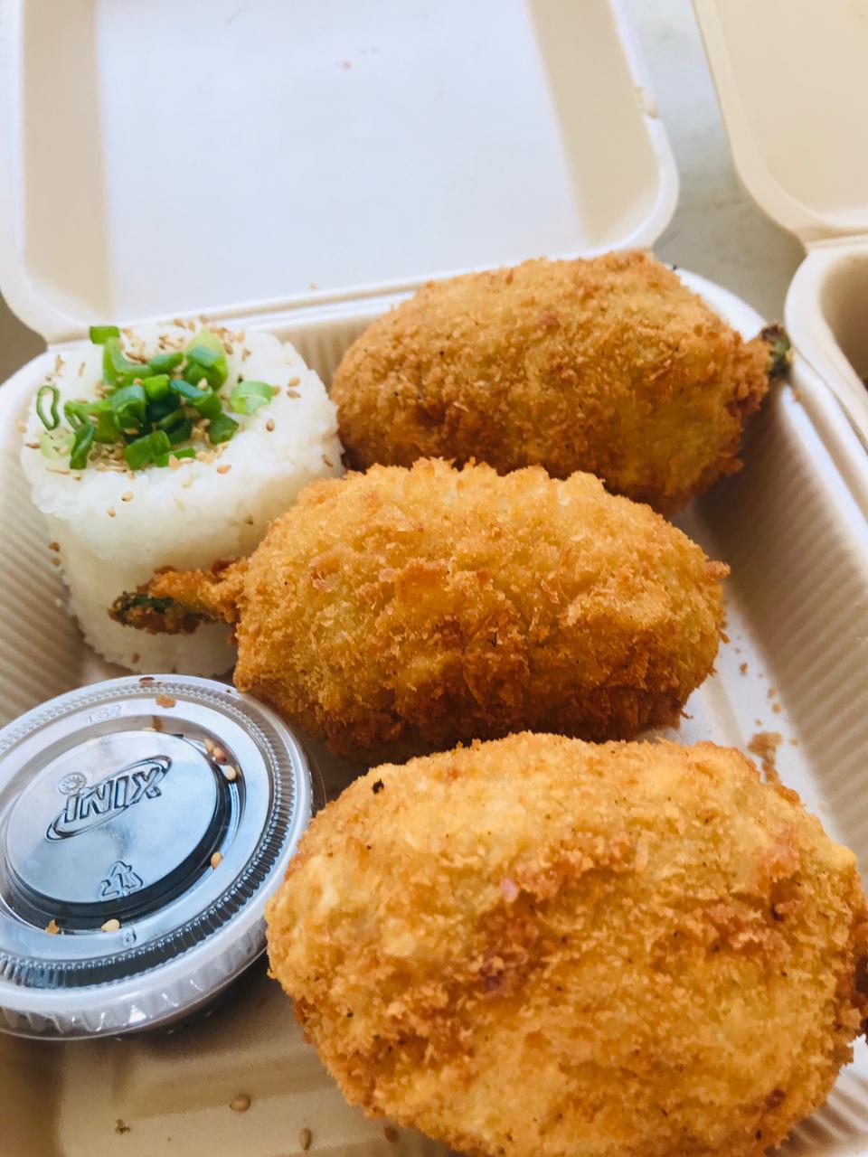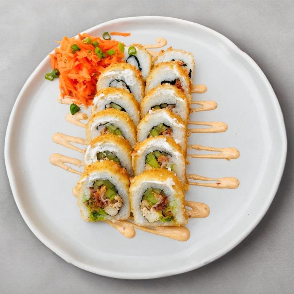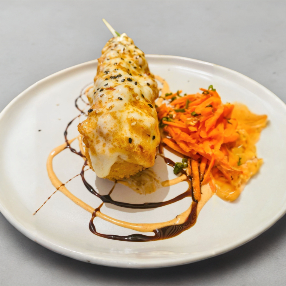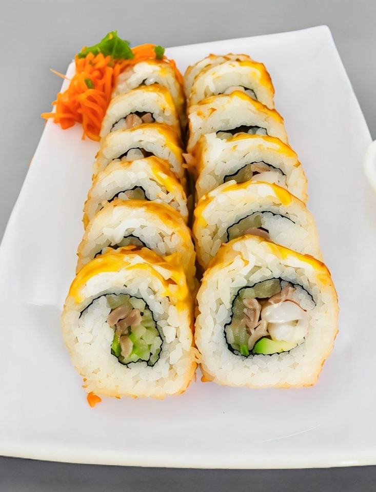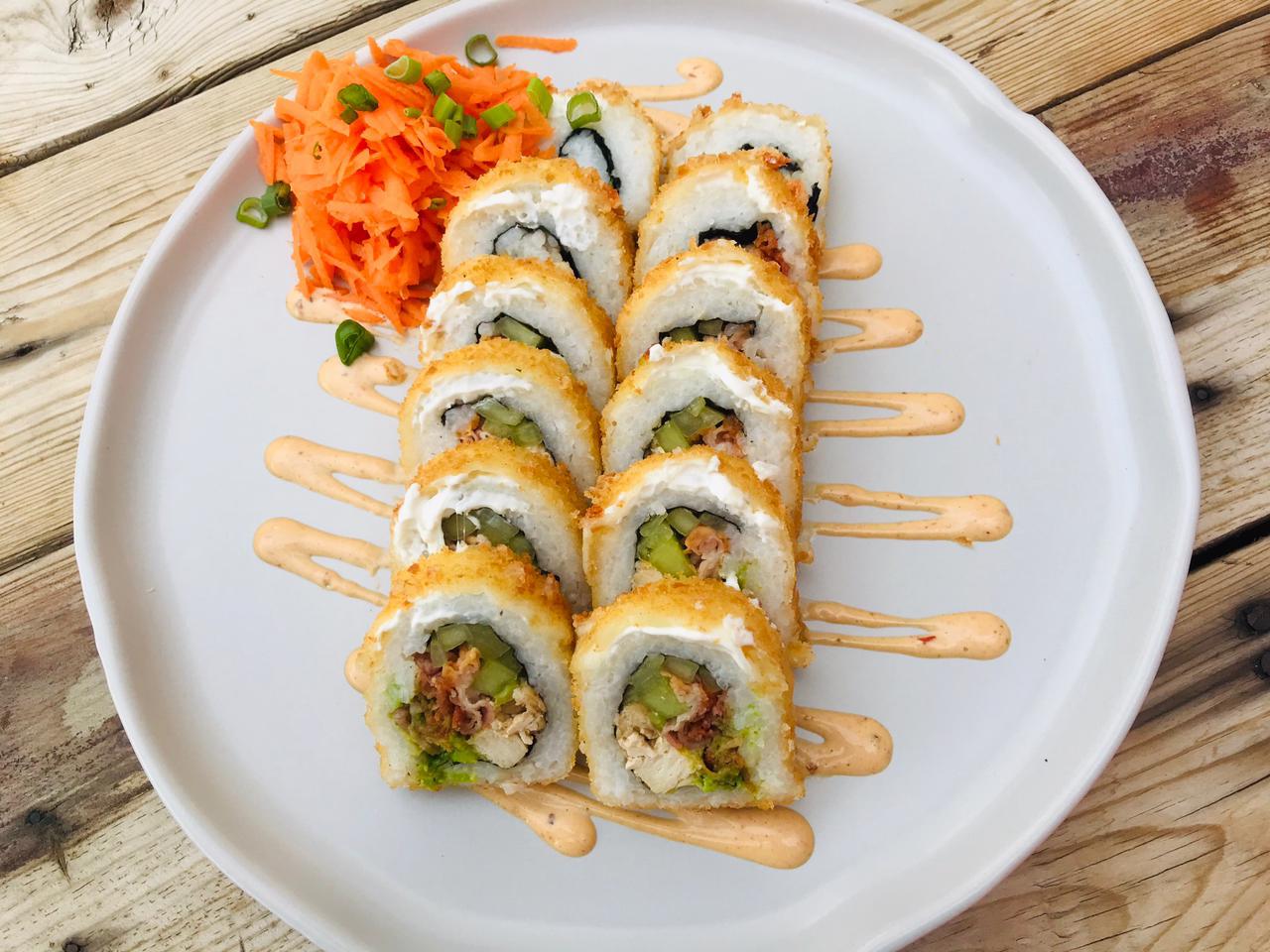 Surimi empanizado, pollo aguacate y Philadelphia. Por fuera: gratinado con queso mozzarella, con trozos de tocino BBQ.