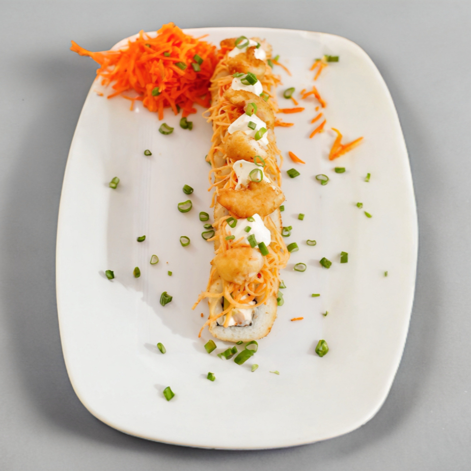 Camarón, philadelphia, pepino y aguacate. Por fuera: Topping kanikama, piladelphia, camarón empanizado en trozos.