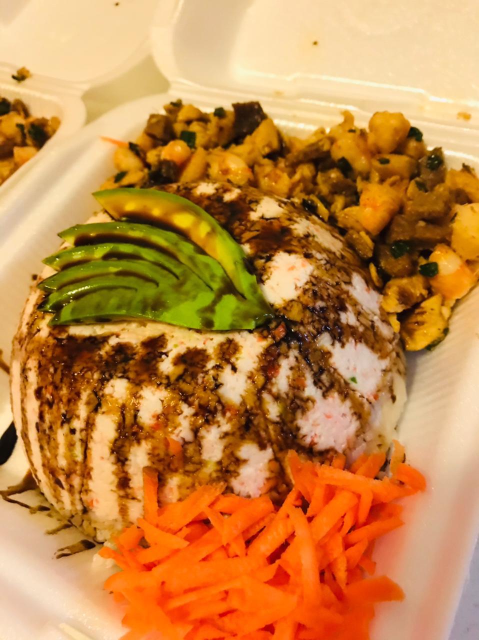 Tazon de arros blanco, philadelphia, tampico, aguacate, res, pollo y camarón.