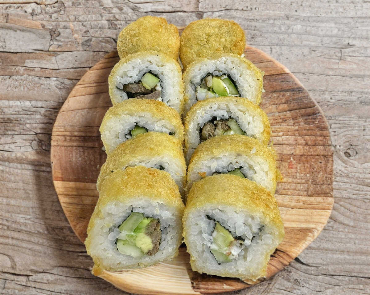 Por dentro camarón, aguacate y pepino, por fuera gratinado con bolitas crispy y salsa de anguila.