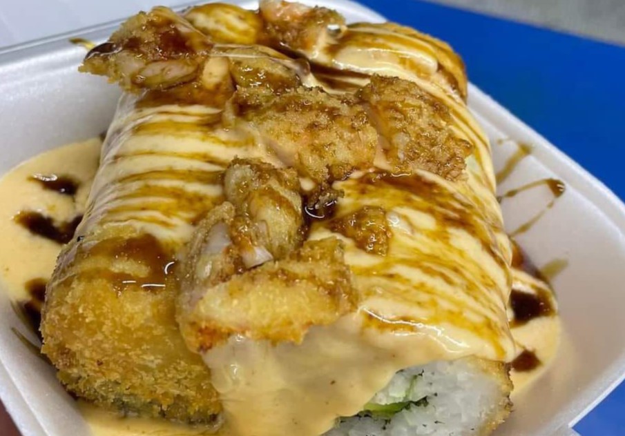 Por dentro camarón, pollo, res y tocino, por fuera tampico, aguacate, salsa de anguila y ajonjolí.