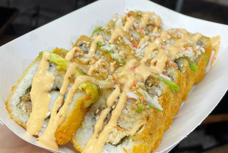 Por dentro camarón empanizado, atún ahumado y cangrejo, por fuera Philadelphia y aguacate, ajonjolí y salsa de anguila.