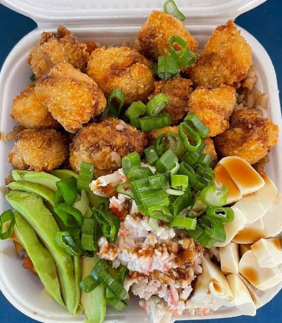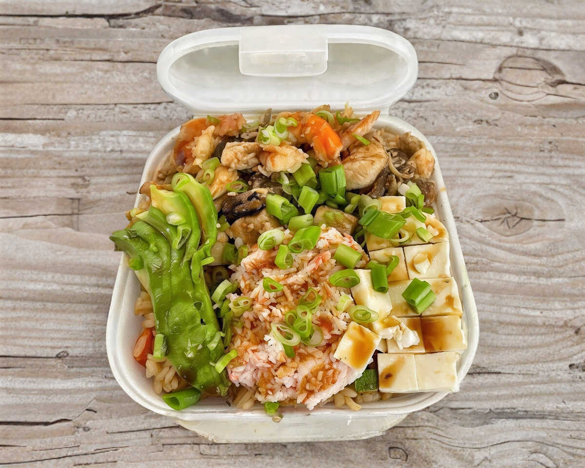 Arroz frito con verduras, camarón, res, pollo, aguacate, tampico, Philadelphia, salsa de anguila y cebollín.