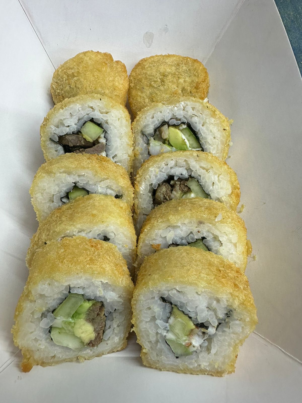 Por dentro camarón empanizado, tampico y pepino, por fuera Philadelphia, aguacate y spicy de camarón con atún ahumado y cebollín.