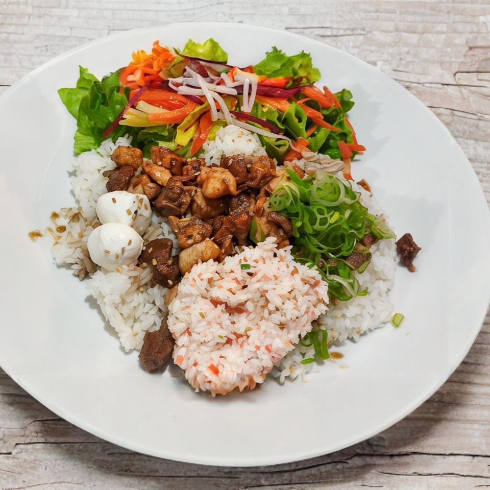 Arroz blanco al vapor con salsa teriyaki acompañado de ensalada de lechugas mixtas y vegetales