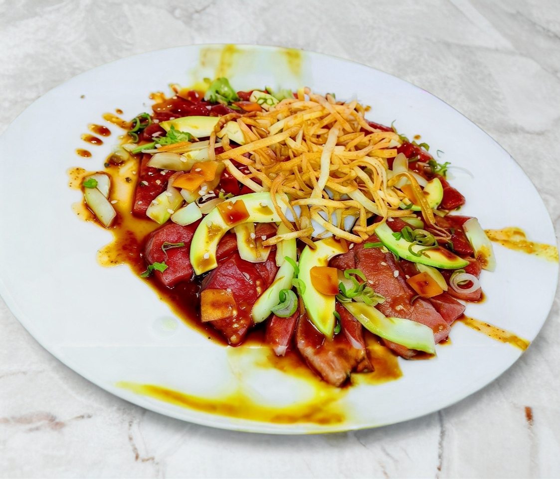 Cortes finos de atún sobre fideos de pepino.