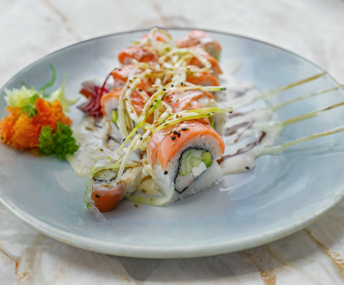 Salmon por fuera por dentro aguacate, pepino, cangrejo y salsa de naranja