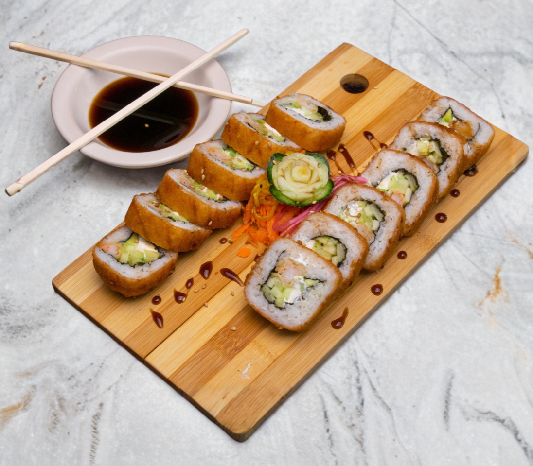 Camaron, pepino, aguacate, queso crema por fuera tampico