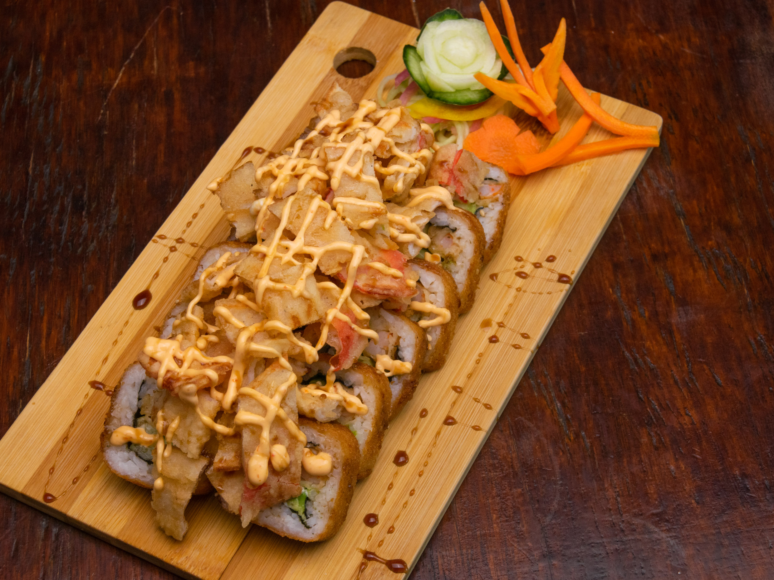 Camaron tempura, pepino, aguacate, y por fuera topping de cangrejo crujiente