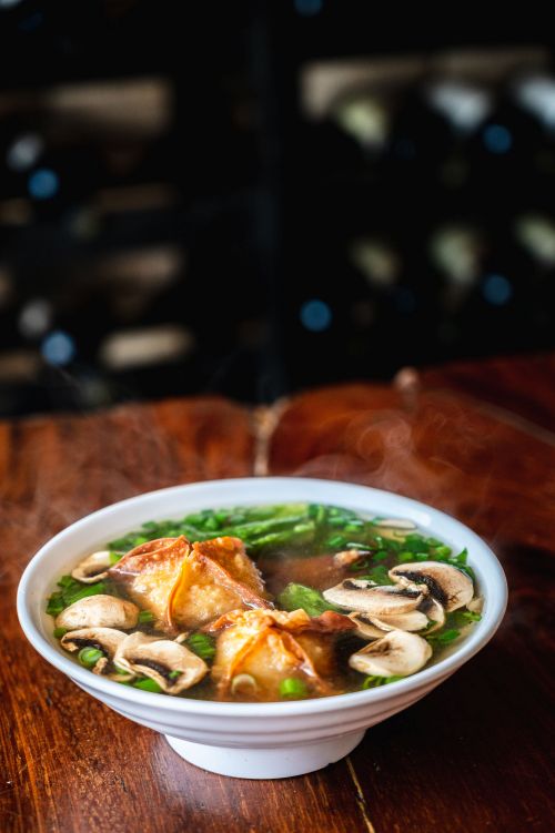 Carne de cerdo al jengibre, envuelto en pasta won ton, con champiñones, lechuga y cebollín.