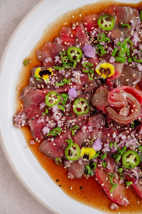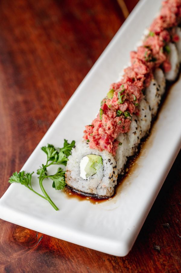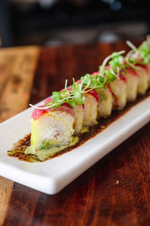 Exquisito rollo relleno de atún, aguacate y queso crema. Montado al centro de camarón roca en aderezo de chipotle