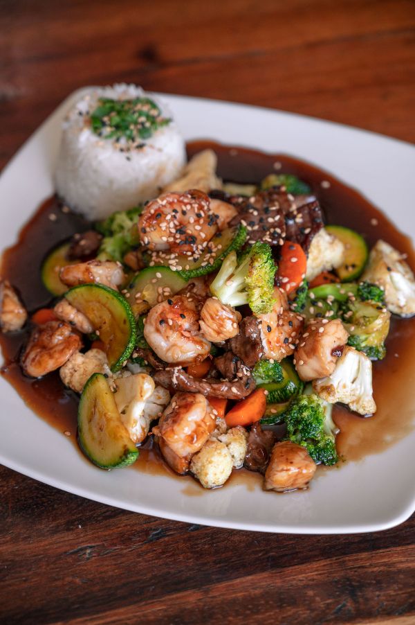 Verduras a la plancha con la carne de su elección sobre una cama de arroz y salsa teriyaki.