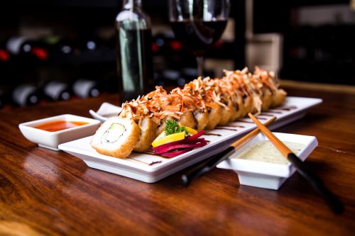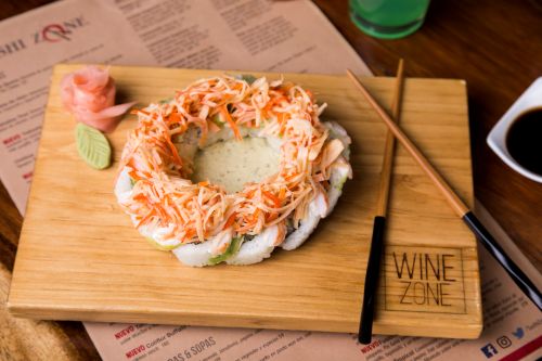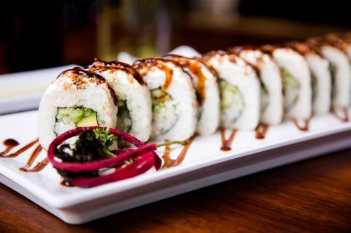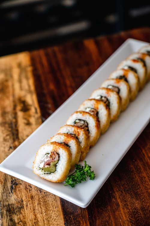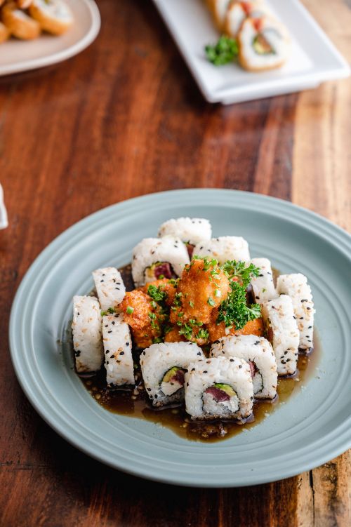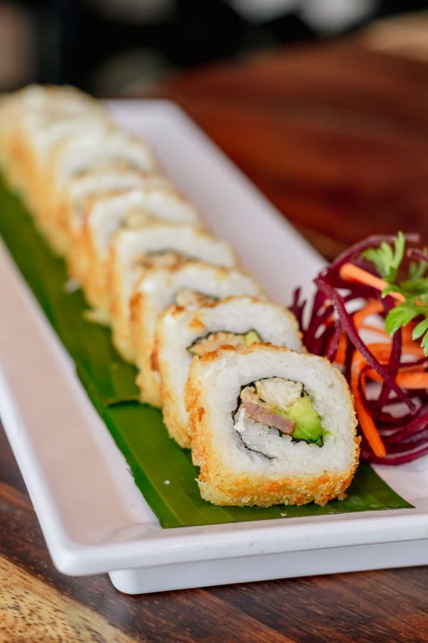 Aguacate, pepino y kanikama. Queso crema, coco tostado, bañado en salsa de mango.