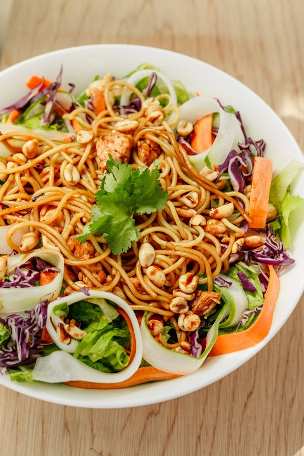 Lechuga, col morada, zanahoria, pepino, cilantro, pollo, noodles y cacahuate, bañado en salsa thai.