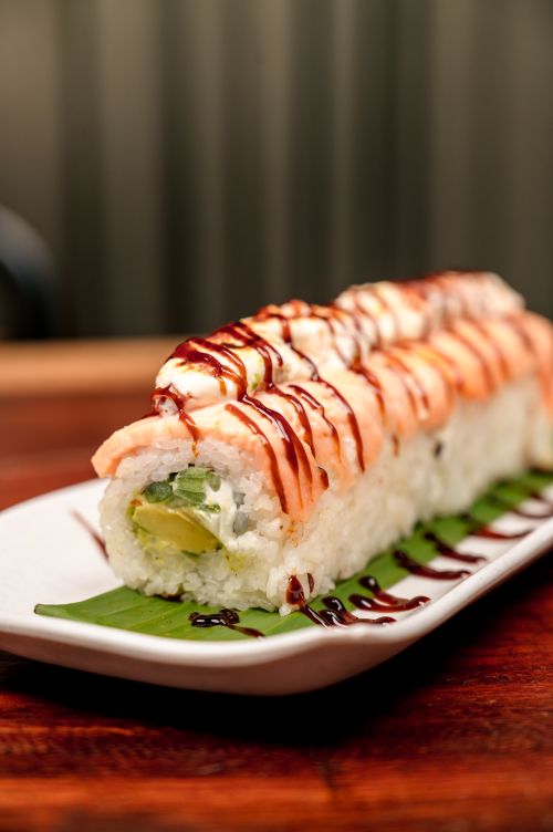 Queso crema, pepino y aguacate. Rodeado de Salmon con un topping de camarón spicy, bañado en salsa de anguila.